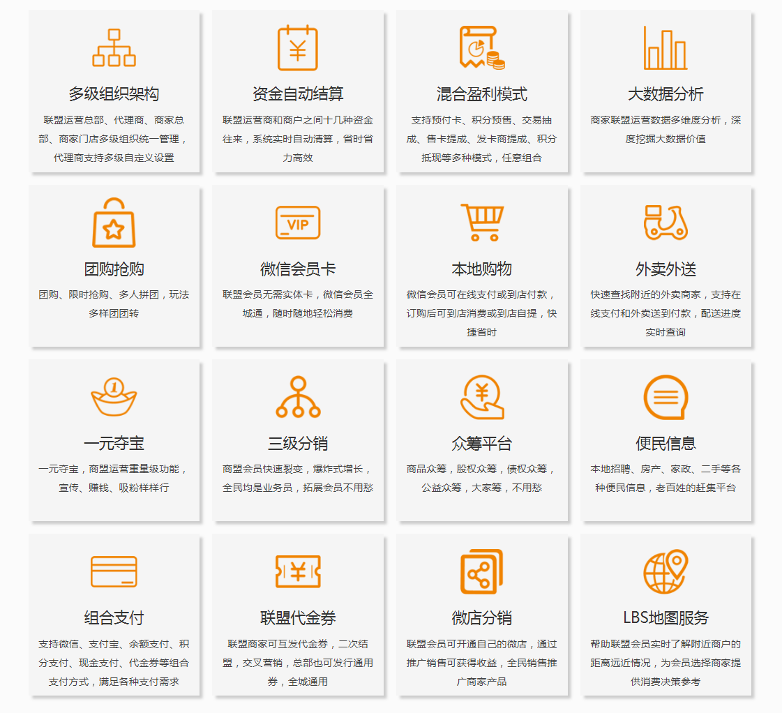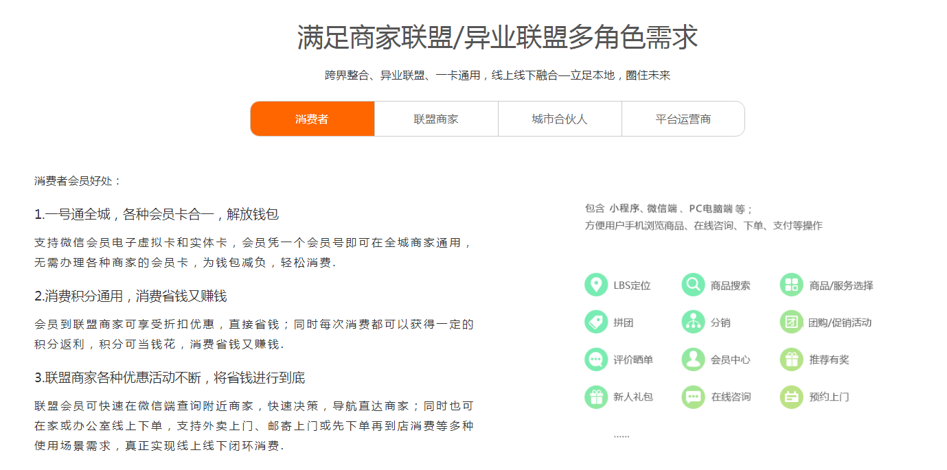 商家联盟系统 是专为全国异业商家进行联盟合作,实现会员共享,店铺共享,积分通用,资源整合而量身设计的一套系统软件。平台基于共享、分销、线上线下闭环3个理念,将跨地区、跨行业、跨领域的商家联合起来,联盟中的商家可相互引流,相互宣传,优劣互补,抱团共赢。消费者会员可凭通用的微信会员卡在平台进行吃、喝、玩、乐、购一条龙服务,享受消费折扣、积分返利、积分抵现、积分换礼等消费增值服务,通过异业整合真正实现平台、商家、消费者三方共赢,激活实体商业潜力。