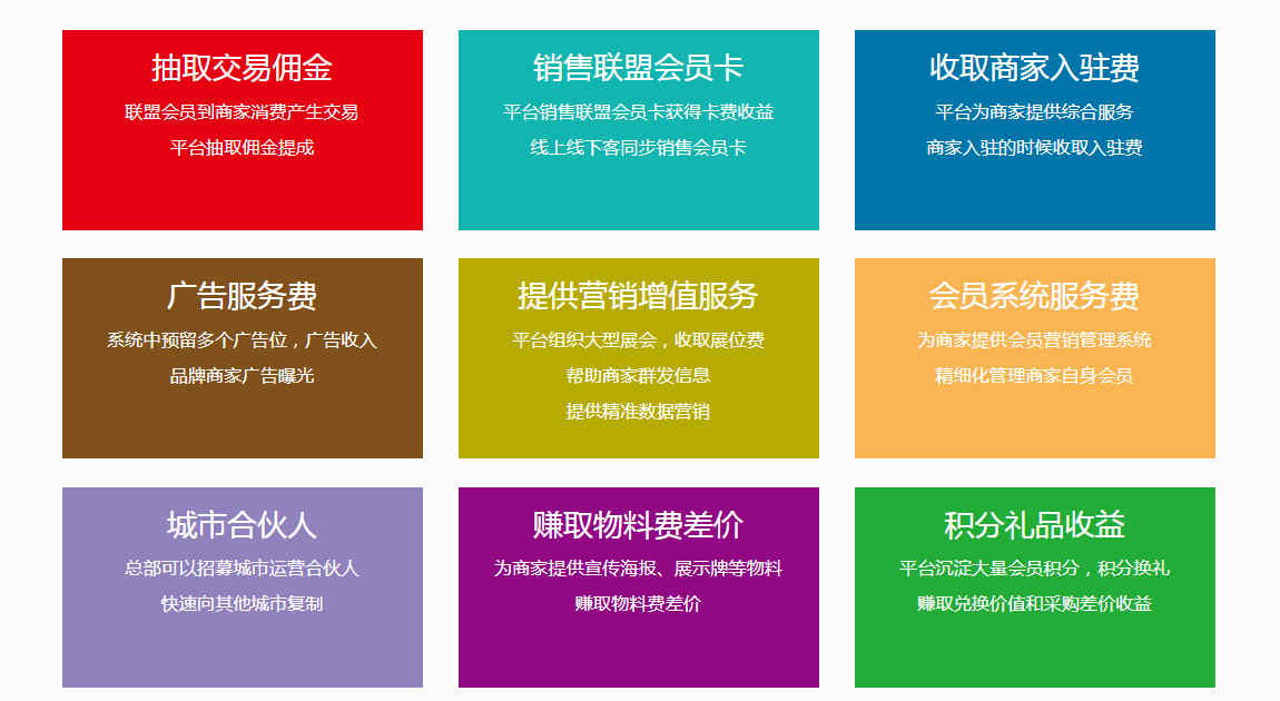 商家发展的会员,到其他的联盟商家去消费,总部都从消费商家的返点中给予会员发展商提成,当会员拿积分去当现金消费时,总部再次给予发卡商提成,实现发卡商利润分批返还。